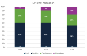 As shown in Figure 1, sovereign wealth funds have dramatically increased their exposure to private markets over the past 15 years. In 2009, private assets represented only about three percent of the average SWF portfolio. By 2024, that share had jumped to roughly one-third of assets. Some of the largest SWFs now allocate more than 50 percent of their portfolios to illiquid assets such as private equity and infrastructure – a level of long-horizon commitment unmatched by pension funds or insurers.
